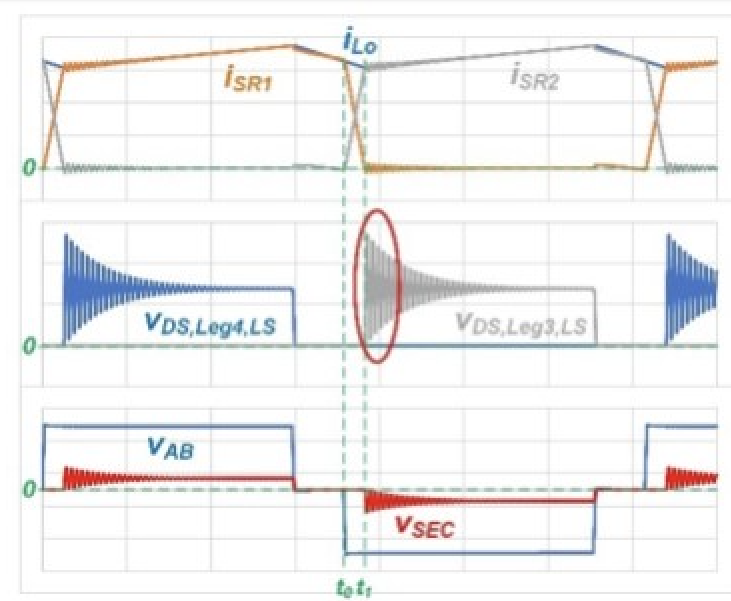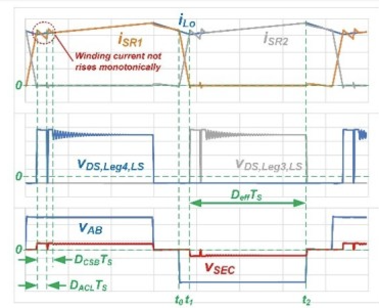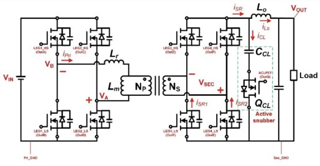 图 2 对于具有有源钳位和波形的 PSFB 功率级,与无源缓冲器不同,有源缓冲器不会消耗功率电阻器上的振铃能量,而是作为无损缓冲器在 LC 谐振回路中实现能量循环。