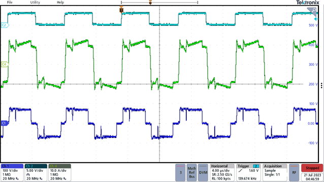 图 4 显示了德州仪器 (TI) 采用有源钳位的54V、3kW相移全桥参考设计的波形。该参考设计是一款400V 输入、54V 输出、3kW PSFB转换器,采用通过TIC2000™ 微控制器实现的有源钳位。在此设计中,变压器匝数比为Np:Ns = 16:3。当 ACL FET 在输出电感器通电期间仅导通300ns时,即使在3kW负载下,输出整流器电压应力(图 4 中的 Ch1)也限制为80V。较低的电压应力使得可以选用耐压等级较低、性能指标更优的 SR FET,从而进一步提升 PSFB 的效率。