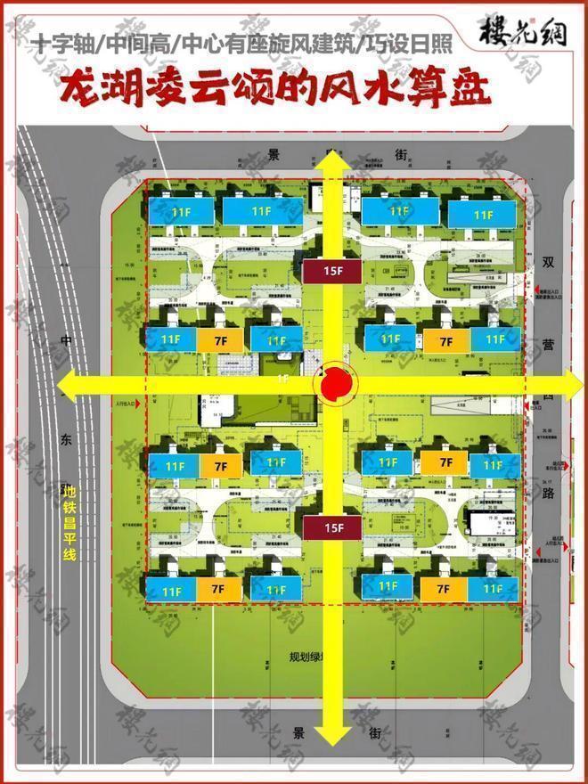 南北中轴上有两栋楼,是最高点,每栋15F,是凌云阁的脊梁,或者应该称为龙脊。